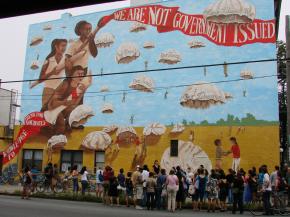 Parachutes fill the sky. The largest reads "Keep Your Illegal War Off..." along with many smaller parachutes with the words "Our Schools," "Our Families," "Our Neighborhoods," "Our Futures," "Our Bodies," "Our Humanity," "Our Morality," "Our Taxes" and "Our Dreams" that drift through the mural.